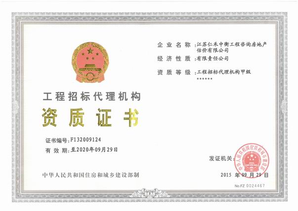 • 招標代理甲級資格證書